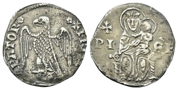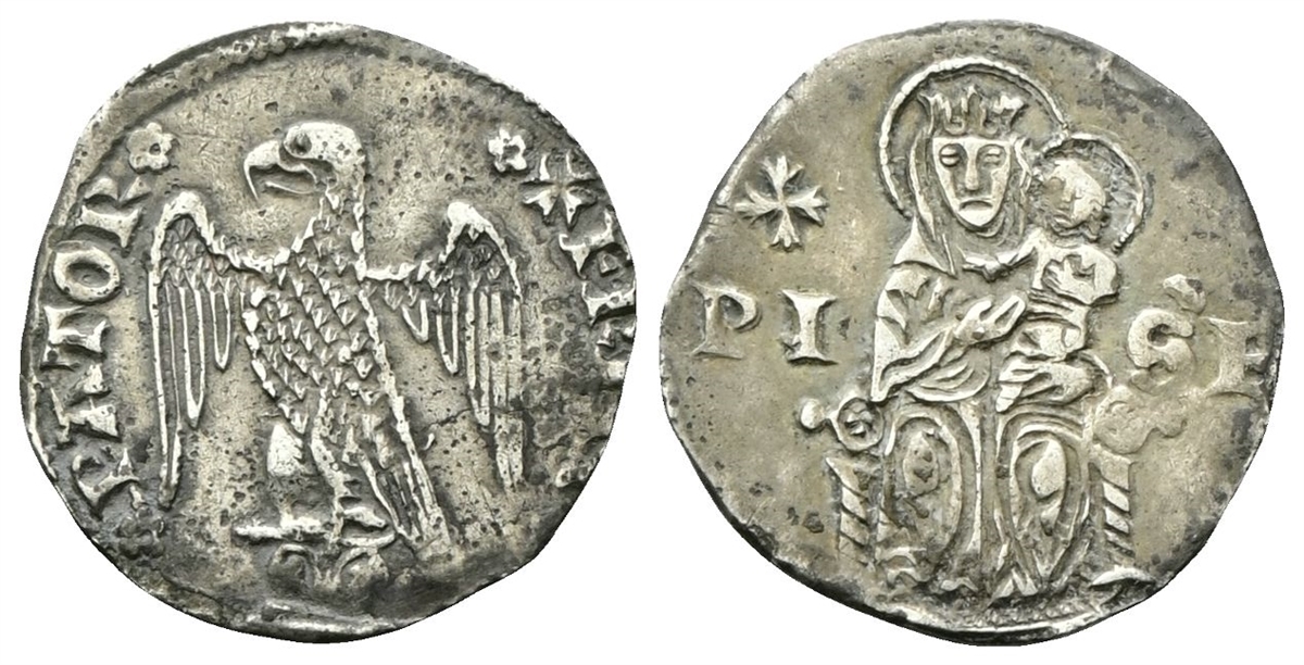 Dr. ✿+ FRIM - ✿PATOR✿. Aquila, ad ali spiegate, stante verso s., su capitello. Rv. La Beata Vergine seduta in trono di fronte con in braccio il Bambino; a s., croce trifogliata; ai lati, PI - SE.