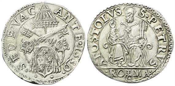 Dr. •SEDE• VAC - ANTE• 1550• - • - •. Stemma Sforza sormontato da padiglione, chiavi decussate con cordoni e fiocchi e cappello cardinalizio. Rv. S• PETRVS - APOSTOLVS. San Pietro, nimbato, seduto in trono, frontale e benedicente regge le chiavi; in esergo,•RO (segno di Girolamo Ceuli) MA•.