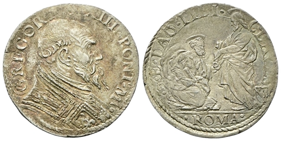 Dr. GREGORIVS• XIII •PONT• M•. Busto a d., con piviale decorato con S. Pietro. Rv. ET • DABO• TIBI• - CLAVES•. Gesù che consegna le chiavi a San Pietro; a d., segno di zecca; in esergo, •ROMA•.
