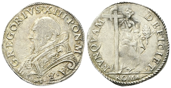 Dr. GREGORIVS• XIII •PON• M• - •A• X•. Busto a s., con piviale ornato della figura di S. Pietro; sotto, segno di zecca. Rv. NVNQVAM - DEFICIET•. La Fede stante regge croce e tiara; in esergo, ROMA.