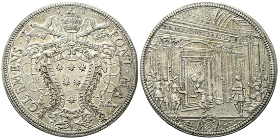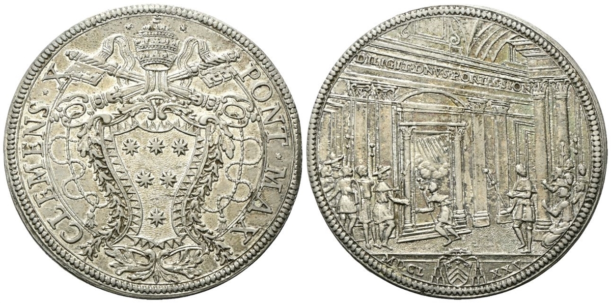 Dr. CLEMENS✶ X - ✶- ✶ - PONT✶ MAX. Stemma sormontato da triregno e chiavi decussate e accostato da fogliami. Rv. DILIGIT • DNVS • PORTAS • SION. Il portico di S. Pietro gremito di pellegrini; in esergo, MDCL armetta Costaguti XXV.