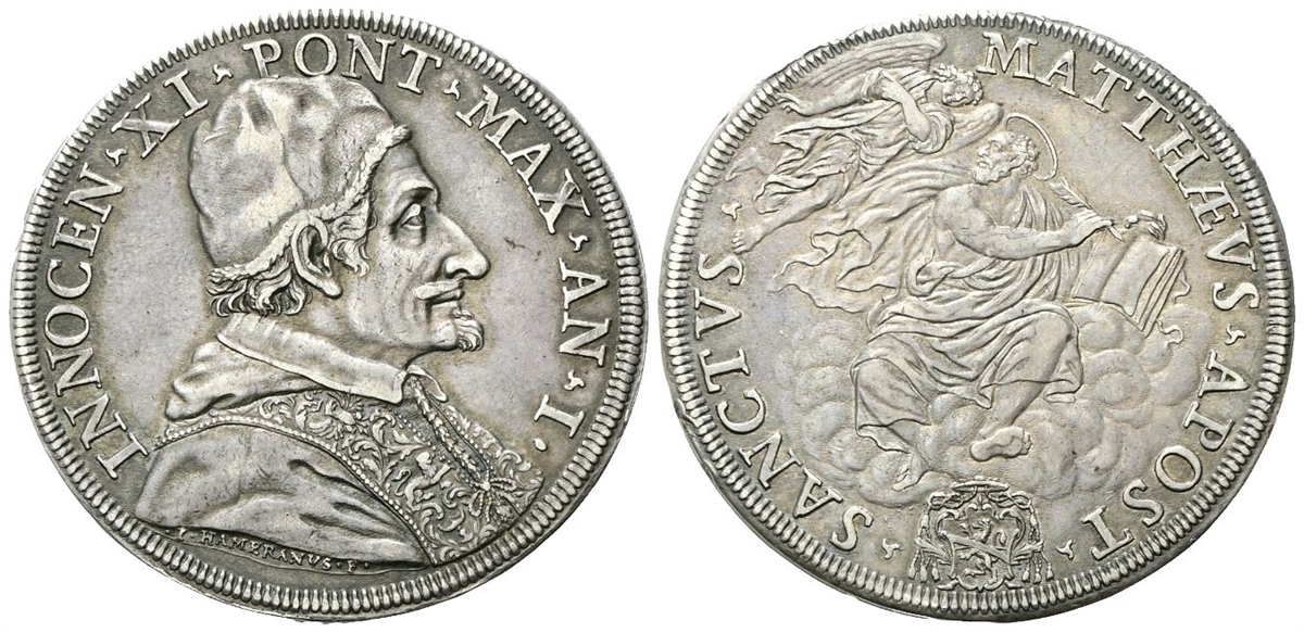 Dr. INNOCEN▴ XI ▴PONT▴MAX ▴AN▴ I•. Busto a d., con camauro, mozzetta e stola ornata da imprese araldiche; sotto, I HAMERANVS F. Rv. ▴SANCTVS▴ - MATTHÆVS▴ APOST▴. San Matteo, seduto sulle nubi, tiene un libro aperto e volge lo sguardo a un angelo in volo verso d.; sotto, armetta Corsi.