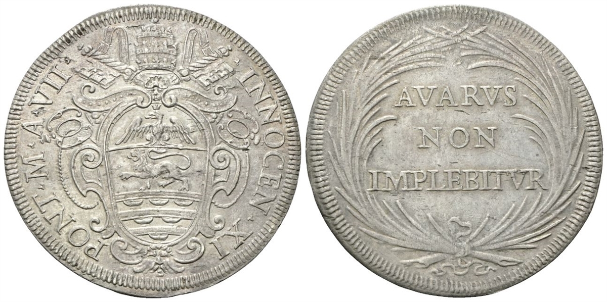 Dr. ▴INNOCEN ▴XI - PONT▴ M▴ A▴ VII▴. Stemma sormontato da triregno e chiavi decussate. Rv. AVARVS / NON / IMPLEBITVR. Iscrizione su tre righe entro cartella ornata da foglie di palma.