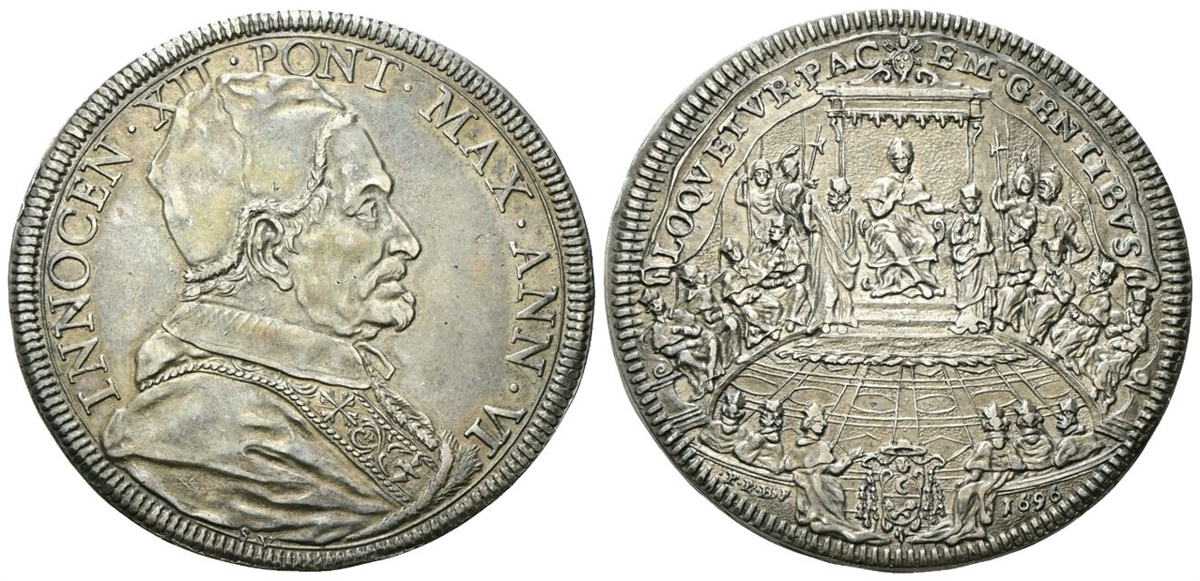 Dr. INNOCEN• XII• PONT• MAX• ANN•VI. Busto a d., con camauro, mozzetta e stola decorata con croce e colomba; sotto, nel giro, S V (Ferdinand de Saint Urban, incisore). Rv. LOQVETVR• PAC - EM• GENTIBVS. Il Pontefice in Concistoro; in esergo, P• P• B •F• (armetta Farsetti) 1696.