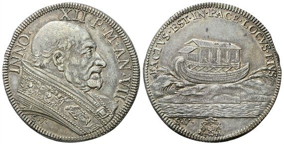 Dr. INNO▴ - XII▴ P▴ M ▴AN▴VII. Busto a d., con piviale decorato con il Redentore e due pignatte; sotto, S • V•. Rv. FACTVS• EST• IN• PACE • LOCVS• EIVS. L’Arca di Noè; a d., S V; in esergo, stemma Farsetti.