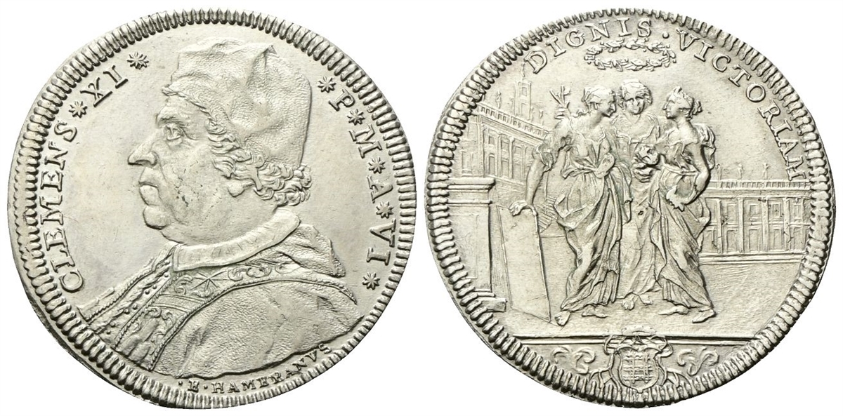 Dr. CLEMENS ✶XI ✶ - ✶P ✶M✶ A✶ VI✶. Busto a s., con camauro e stola decorata con imprese araldiche; sotto il taglio del braccio, •E •HAMERANVS. Rv. DIGNIS •VICTORIAM. Le tre Grazie in piazza del Campidoglio; sulle loro teste, una corona di alloro; in esergo, stemma Falconieri tra arabeschi.