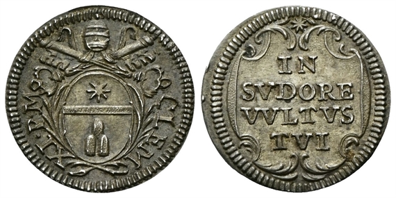 Dr. CLEM - XI • P M. Stemma sormontato da chiavi decussate. Rv. IN / SVDORE / VVLTVS / TVI. Iscrizione entro cartella.