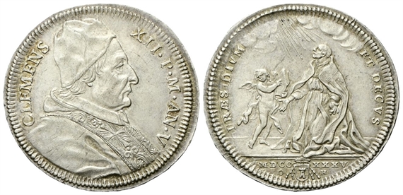 Dr. CLEMENS - XII •P• M• AN• V. Busto a s. con camauro, mozzetta e stola. Rv. PRAESIDIVM - ET DECVS. San Andrea Corsini inginocchiato verso s., dinanzi a un angelo che gli offre la mitria; in esergo, MDCC (stemma Casoni) XXXV; ai lati, O - H.