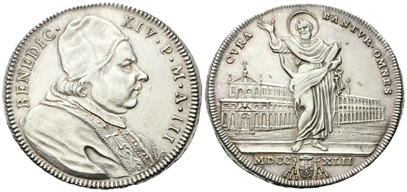 Dr. BENEDIC• - XIV •P •M• A• III. Busto a d. con camauro, mozzetta e stola ornata da croce e rabeschi. Rv. CVRA - BANTVR OMNES. San Pietro, nimbato, stante de frontale; sullo sfondo, l'ospedale di Santo Spirito; in esergo, MDCC (armetta Banchieri) XLII.