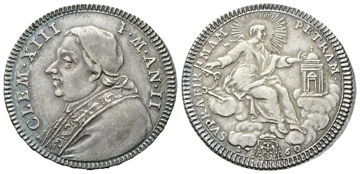 Dr. CLEM •XIII - P• M• AN •II. Busto a s., con camauro e piviale decorato da croce raggiante e arabeschi. Rv. SVPRA• FIR - MAM - PETRAM•. La Chiesa seduta verso s., tra le nubi; sotto, 17 (stemma De Vecchis) 60.