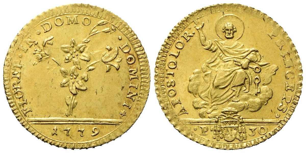 Dr. FLORET• IN •DOMO - •DOMINI✶. Pianta di giglio con quattro fiori; in esergo, 1779. Rv. APOSTOLOR: - PRINCEPS•. San Pietro stante su nubi con la d. alzata e la mano s. che stringe la chiave; in esergo, •P• (armetta Vai) 30.