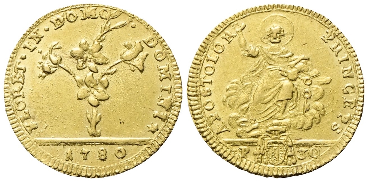 Dr. FLORET• IN •DOMO - •DOMINI✶. Pianta di giglio con quattro fiori; in esergo, 1780. Rv. APOSTOLOR - PRINCEPS. San Pietro stante su nubi con la d. alzata e la mano s. che stringe la chiave; in esergo, •P• (armetta Vai) 30.