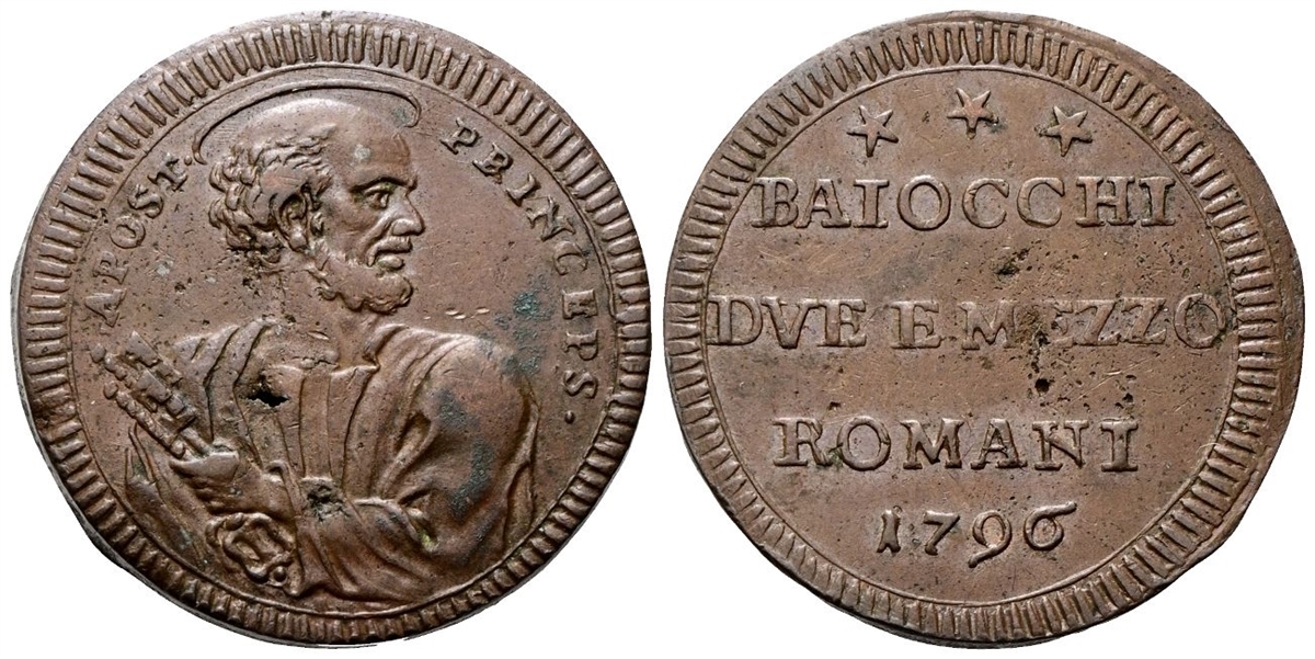 Dr. APOST• - PRINCEPS•. Busto a d. con le chiavi in mano. Rv. BAIOCCHI / DVE E MEZZO / ROMANI / 1796. Iscrizione entro cerchio lineare.
