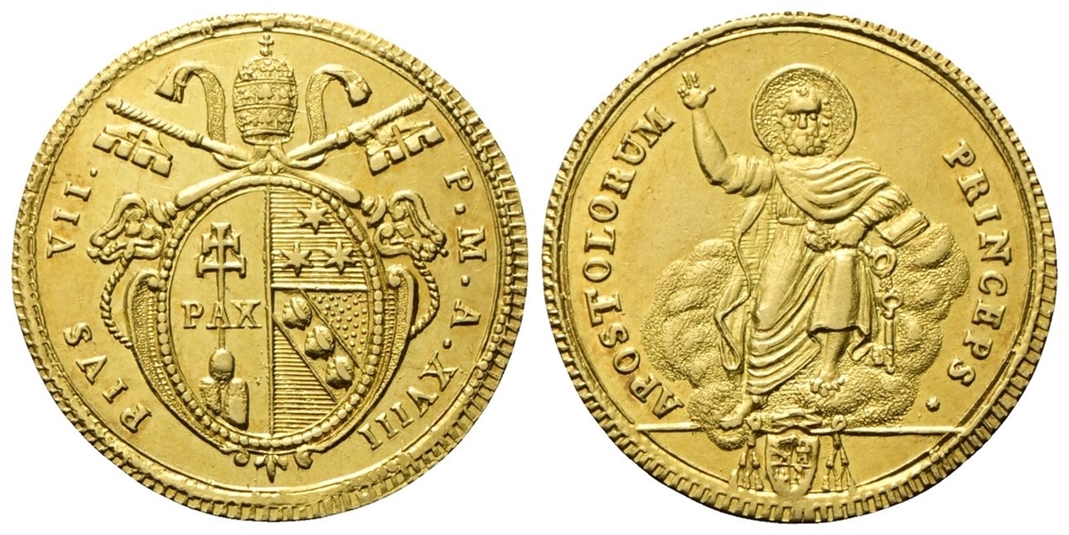 Dr. PIVS VII• - P•M•A•XVIII. Stemma ovale in cornice sormontato da triregno e chiavi decussate. Rv. APOSTOLORUM - PRINCEPS•. San. Pietro nimbato seduto di fronte sulle nubi, benedice con la d. e tiene chiavi con la s.; in esergo, stemma Zambelli de Turribus.