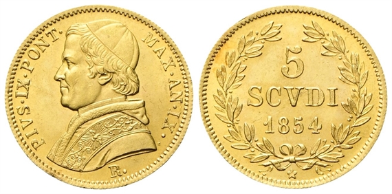 Pio IX (Giovanni Maria Mastai Ferretti), 1846-1878. 5 Scudi 1854 a. IX.