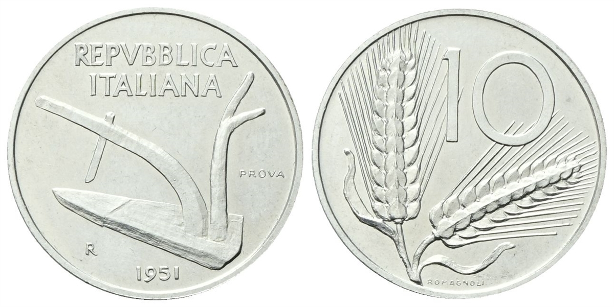 Repubblica Italiana, dal 1946. 10 Lire 1951 PROVA.