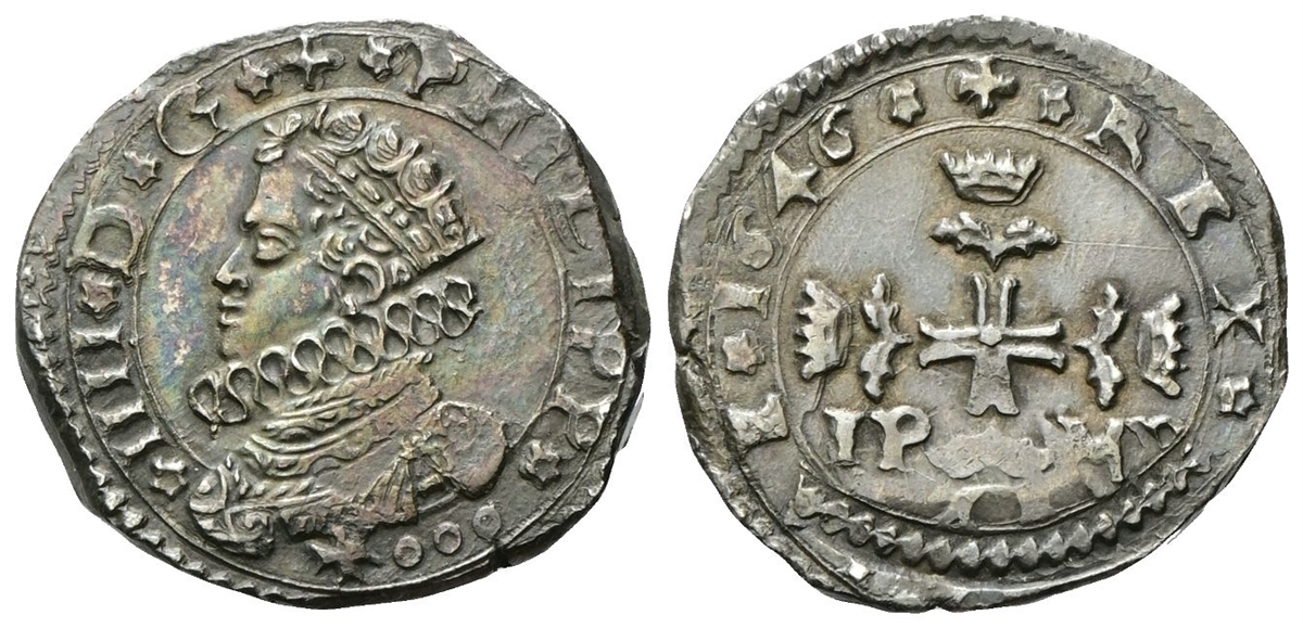 Dr. +★PHILIPP★ - ★ III★ D★G.★. Busto corazzato, coronato, con colletto alla spagnola, a s. Rv. + ★REX★ - [SICILI]AE ★1646.★ Croce con le braccia terminanti in fiamme sormontate da corone; nei quarti inferiori, IP - MP.