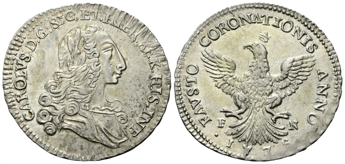 Dr. CAROLVS• D• G• SIC• ET• HIER• REX• HIS• INF. Busto laureato a d. Rv. FAVSTO - CORONATIONIS - ANNO. Aquila coronata ad ali spiegate; ai lati, F - N; sotto, •173S•.