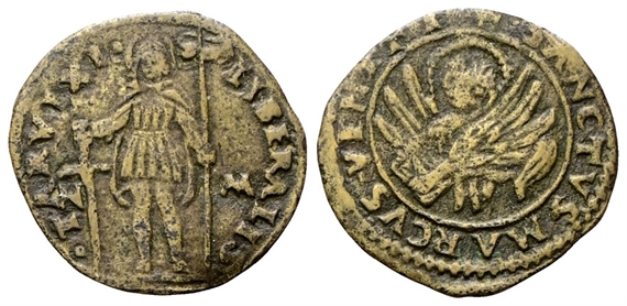 Dr. S LIBERALIS - •TARVIXI•. Il Santo nimbato stante, regge la spada puntata a terra e il vessillo; ai lati, N - M. Rv. +SANCTVS MARCVS VENETI. Leone in soldo.