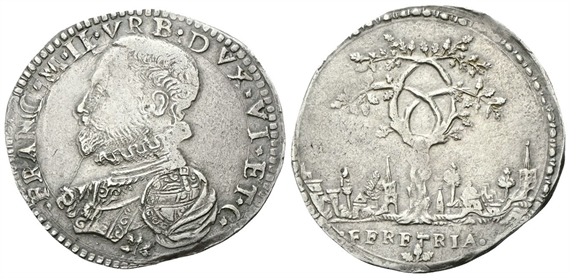 Dr. •FRANC• M• II •VRB •DVX •VI• ET• C•. Busto corazzato con gorgiera a s. indossa grande collare e Toson d’oro; sotto, rametto di quercia. Rv. Grande albero di rovere con la veduta del territorio del Montefeltro; in esergo, •FERETRIA•.