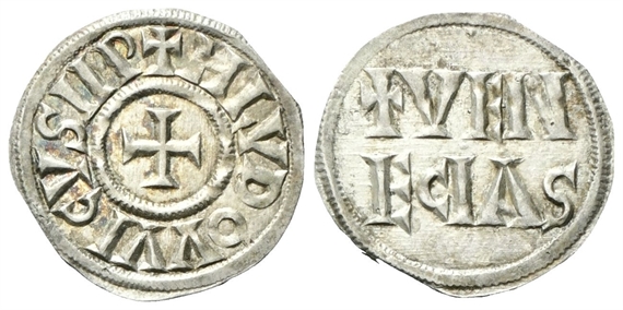 Dr. +HLVDOVVICVS IMP. Croce patente. Rv. +VEN / ECIAS. Iscrizione disposta su due righe.