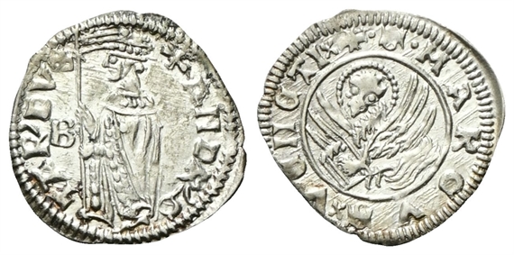 Dr. +ANDR'9 - TAR'DVX. Il doge genuflesso verso s., regge il vessillo con entrambe le mani; a s., B. Rv. +•S•MARCVS+VENETI+. Leone in soldo.