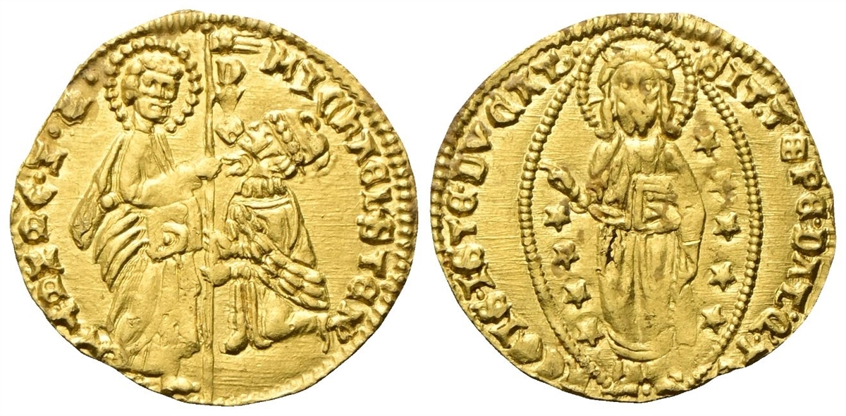 Dr. MIChAEL•STEN' - •S•M•VENETI. San Marco stante verso d., porge il vessillo al Doge genuflesso; lungo l’asta, sotto l’orifiamma, D/V/X. Rv. •SIT•T•XPE•DAT•Q•TV - REGIS•ISTE•DVCAT'. Il Redentore stante e frontale entro aureola ellittica cosparsa di stelle.