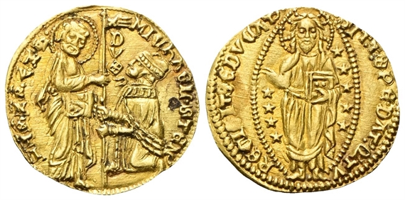 Dr. MIChAEL•STEN' - •S•M•VENETI. San Marco stante verso d., porge il vessillo al Doge genuflesso; lungo l’asta, sotto l’orifiamma, D/V/X. Rv. •SIT•T•XPE•DAT•Q•TV - REGIS ISTE DVCAT'. Il Redentore stante e frontale entro aureola ellittica cosparsa di stelle.