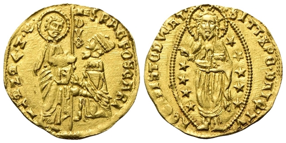 Dr. fRAC•FOSCARI - S•M•VENETI. San Marco stante verso d., porge il vessillo al Doge genuflesso; lungo l’asta, sotto l’orifiamma, D/V/X. Rv. •SIT T XPE•DAT Q' TV - REGIS ISTE•DVCAT•. Il Redentore stante e frontale entro aureola ellittica cosparsa di stelle.