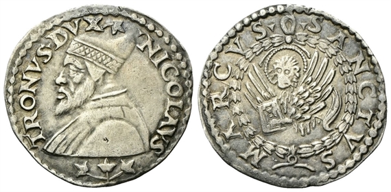 Dr. (Foglia d'edera)▾NICOLAVS - ▾TRONVS▾DVX. Busto a s., con il corno dogale; sotto il busto, ramo d’edera con tre foglie. Rv.◂SANCTVS▾ - ▾MARCVS◂. Leone in soldo entro corona.