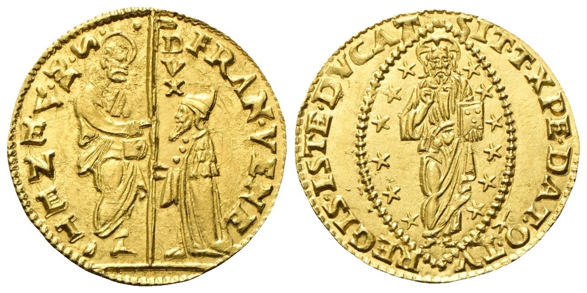 Dr. FRAN•VENE - •S•M•VENET. San Marco stante verso s., porge il vessillo al Doge genuflesso; lungo l’asta, sotto l’orifiamma, D/V/X. Rv. SIT• T•XPE•DAT•Q'•TV - REGIS•ISTE•DVCAT. Il Redentore stante e frontale entro aureola ellittica cosparsa di stelle.