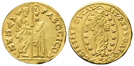Dr. PASC•CICON - S M VENE•. San Marco stante verso s., porge il vessillo al Doge genuflesso; lungo l’asta, sotto l’orifiamma, D/V/X. Rv. SIT•T•XPE•DAT•Q•TV - REGIS•ISTE•DVCAT•. Il Redentore stante e frontale entro aureola ellittica cosparsa di stelle.