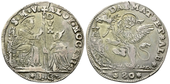 Dr. ✶S✶M✶V - ALOY✶MOCENI. San Marco nimbato, seduto in trono, benedice il doge genuflesso, che regge il vessillo; lungo l'asta, D/V/X; in esergo, ✶B•G✶ (Bernardo Gritti massaro). Rv. DALMAT✶ET✶ALB✶. Leone alato e nimbato rampante, tiene nella zampa d. un ramo d'ulivo; sullo sfondo, torre con bandiera; in esergo, ✶80✶.