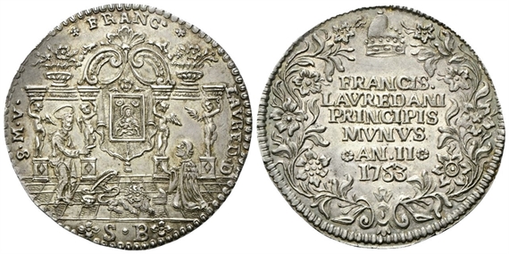 Dr. S• M• V• - ✿FRANC• ✿ - LAVRED• D. San Marco, stante verso s., davanti a un colonnato riccamente decorato che racchiude al centro un quadro della Madonna; a d., il Doge in preghiera e tra i due un servizio da scrittoio, il leone accovacciato e il corno dogale; in esergo, ✤S•B✤ (Stefano Barbaro, massaro). Rv. FRANCIS• / LAVREDANI / PRINCIPIS / MVNVS / ✿AN• II ✿ / 1753. Iscrizione disposta su sei righe entro corona di fiori chiusa in alto da corno dogale.