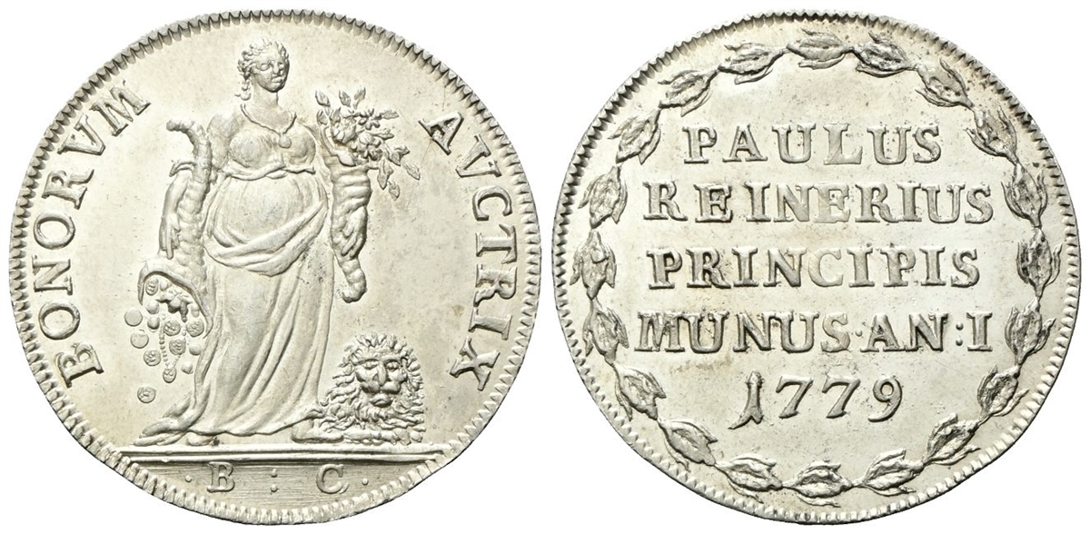 Dr. BONORVM - AVCTRIX. L’Abbondanza stante verso d., tiene nella s. una cornucopia con fiori, mentre nella d. stringe una cornucopia capovolta, dalla quale escono monete; ai suoi piedi, un leone; in esergo, •B:C• (Benetto Capello). Rv. PAULUS / REINERIUS / PRINCIPIS / MUNUS AN I / 1779. Iscrizione disposta su cinque righe entro corona d'alloro.