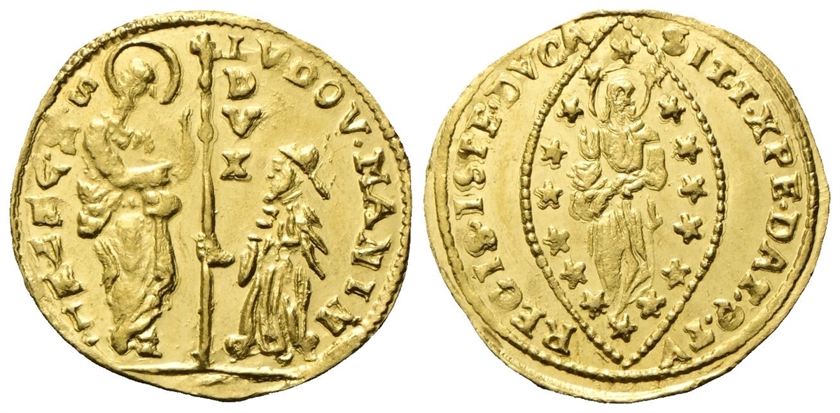 Dr. LVDOV•MANIN - S•M•VENET•. San Marco stante verso d., porge il vessillo al Doge genuflesso; lungo l’asta, sotto l’orifiamma, D/V/X. Rv. SIT•T•XPE•DAT•Q•TV - REGIS•ISTE•DVCA. Il Redentore stante e frontale entro aureola ellittica cosparsa di stelle.