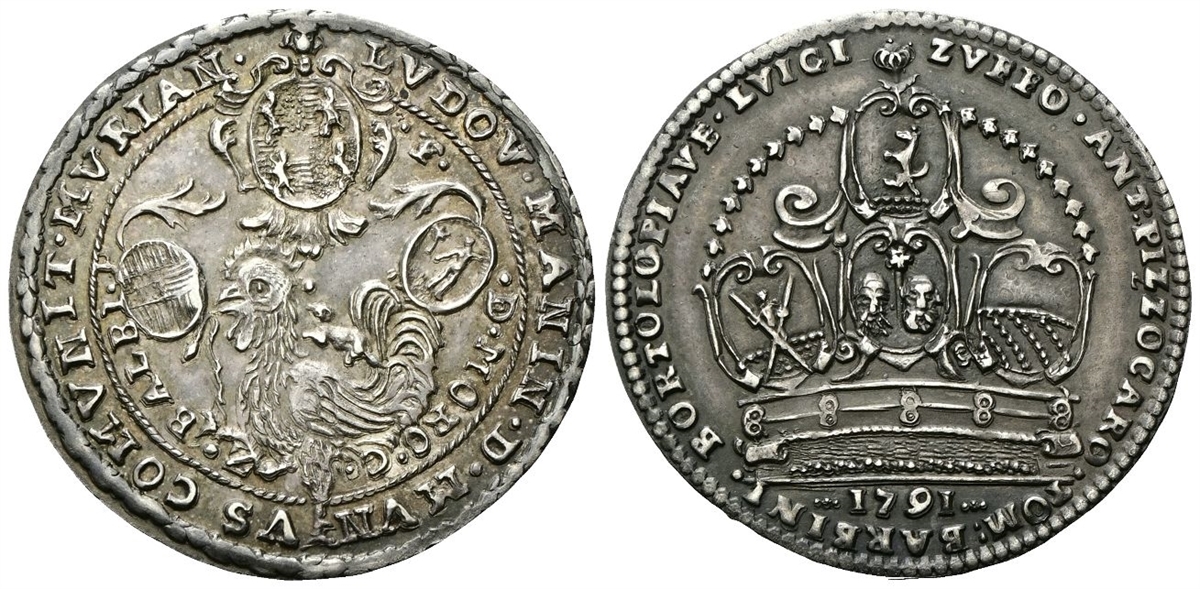 Dr. LVDOV •MANIN •D •MVN - VS COMVNIT• MVRIAN• / •F• - •D• MORO• C• - Z• - BALBI •. Grande gallo di Murano sormontato dall’arme del Doge e accostato da quelle del Podestà e del Camerlengo. Rv. BORTOLO PIAVE •LVIGI - ZVFFO •ANT: PIZZOCARO •TOM : BARBINI•. Gli stemmi dei quattro Deputati racchiusi da un arco di foglioline; sotto, un ponte; in esergo, 1791.