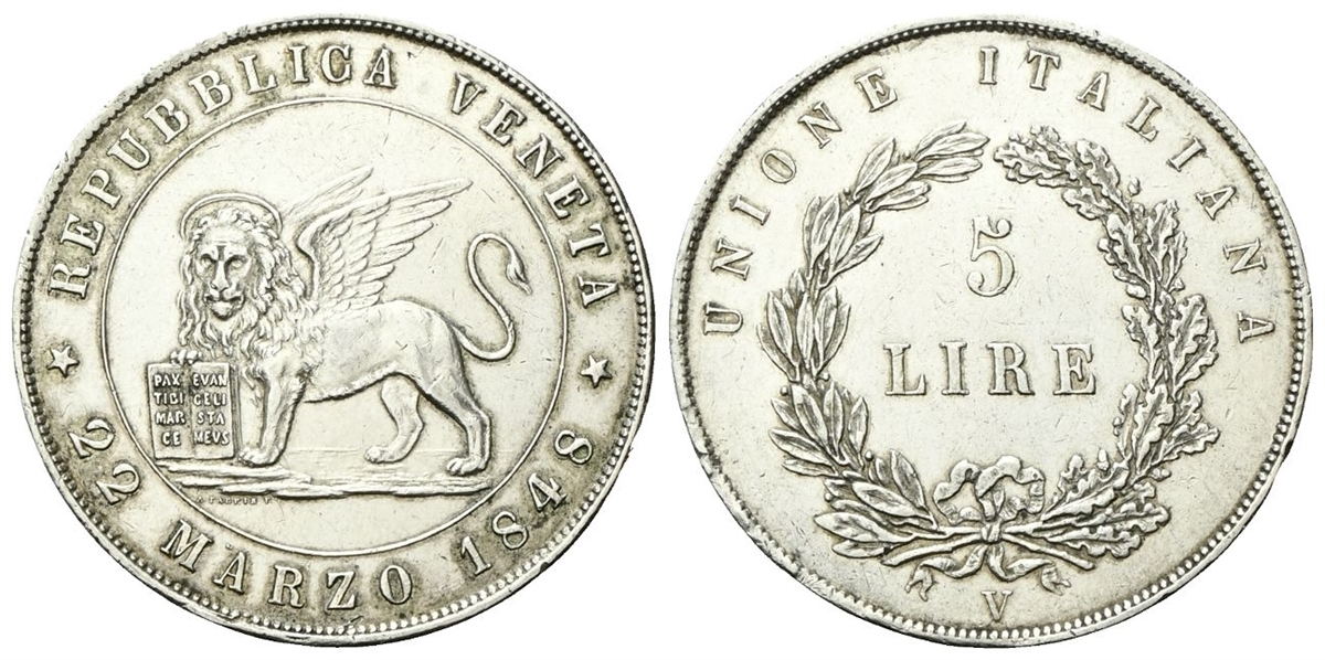 Dr. ★REPUBBLICA VENETA★ / 22 MARZO 1848. Leone nimbato ed alato entro cerchio. Rv. UNIONE ITALIANA. Valore tra un ramo di lauro ed uno di quercia.