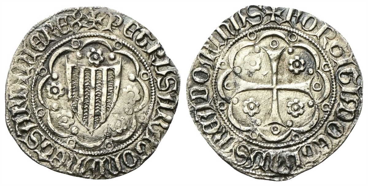Dr. +PETRVS ARAGONVM ET SARDINIE REX. Stemma a cuore in cornice. Rv. +FORTITVDO ET LAVS MEA DOMINVS. Croce e quattro rose in cornice.