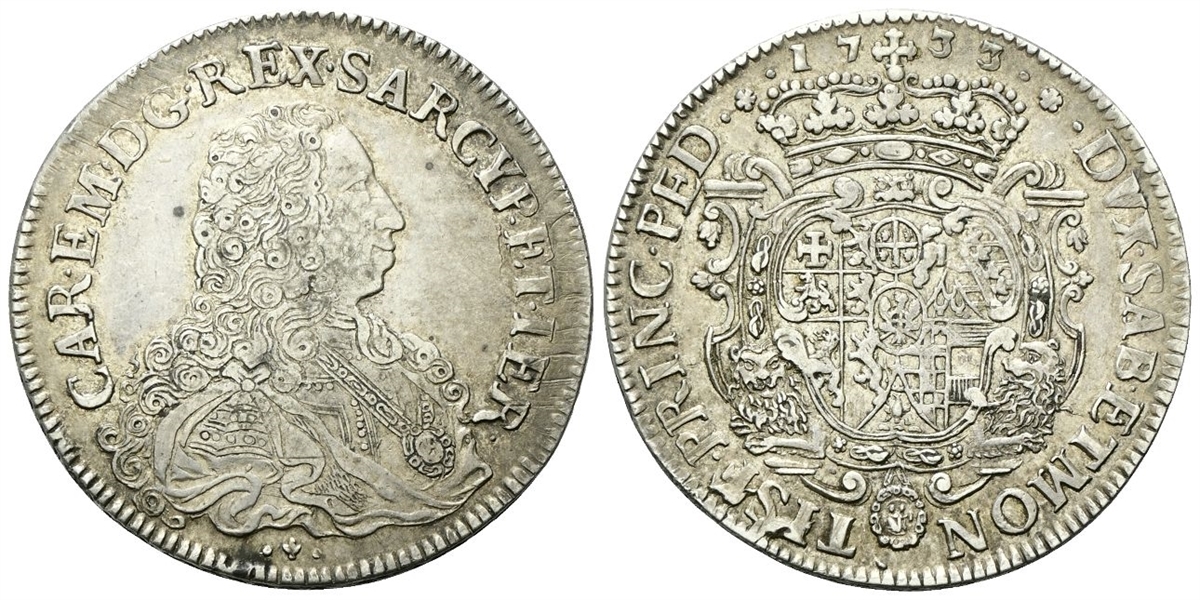 Dr. CAR•EM•D•G•REX•SAR•CYP•ET•IER. Busto corazzato e drappeggiato a d., con Collare dell’Annuziata pendente sul petto. Rv. ✿•DVX• SAB•ET MON -TIF•PRINC•PED•✿. Stemma coronato circondato dal Collare della Annunziata e accostato da due leoni accovacciati.
