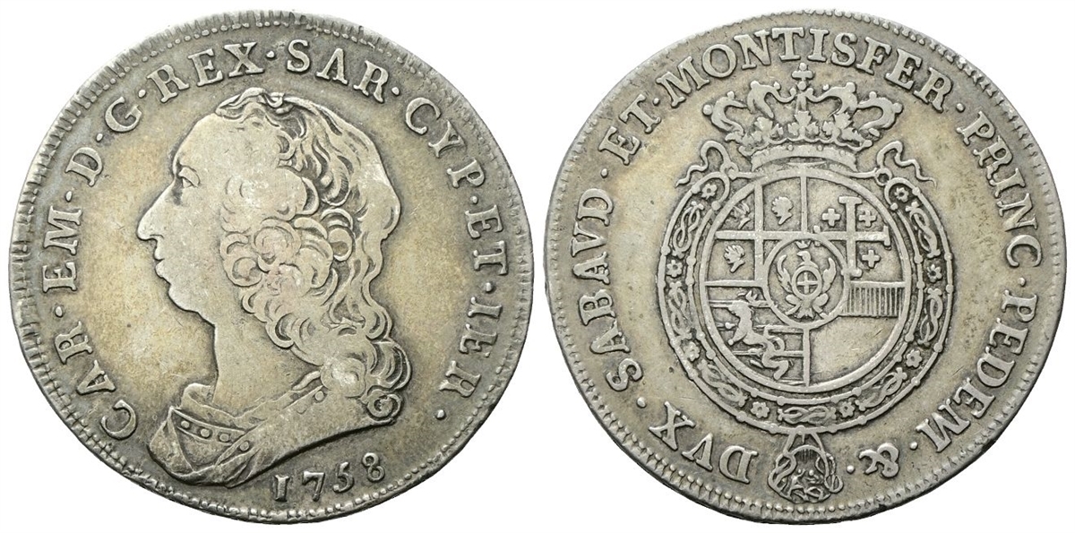 Dr. CAR •EM •D •G •REX• SAR• CYP• ET• IER•. Busto paludato a s., con lunga capigliatura; sotto il taglio del busto, 1758. Rv. DVX• SABAVD •ET •MONTISFER• PRINC• PEDEM •&•. Stemma coronato rotondo circondato da collare dell’Annunziata.