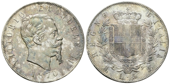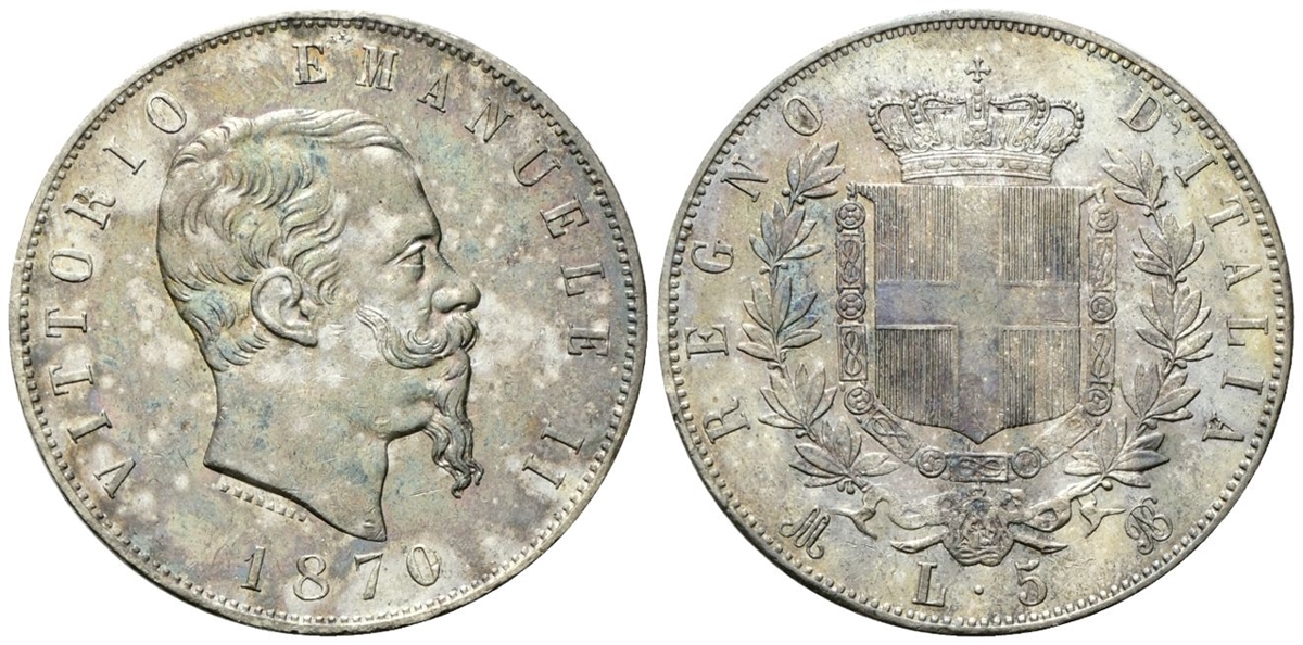 Vittorio Emanuele II, 1861-1878. 5 Lire 1870 Milano.