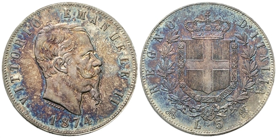 Vittorio Emanuele II, 1861-1878. 5 Lire 1874 Milano.