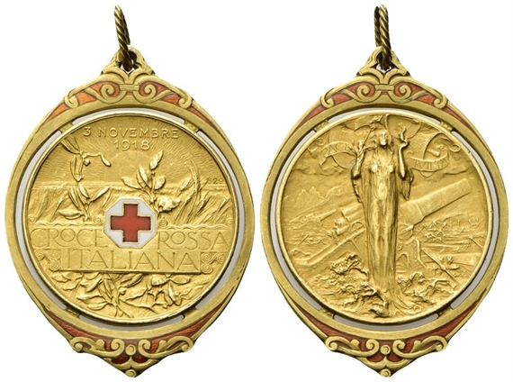 Moneta-Medaglia fatto coniare dal Comitato di Propaganda della Croce Rossa di Milano, per commemorare la vittoria del primo conflitto mondiale, ideato dal prof. Adolfo Padovan, direttore del medesimo Comitato. La medaglia qui proposta è stata composta e ideata dallo sculture Giannino Castiglioni e fatto coniare dalla ditta Johnson: il gettone in oro costava 200 lire, quello in argento 25 lire e quello in bronzo 10 lire, presso lo stesso Comitato in piazza della Scala al n. 3, su prenotazione.