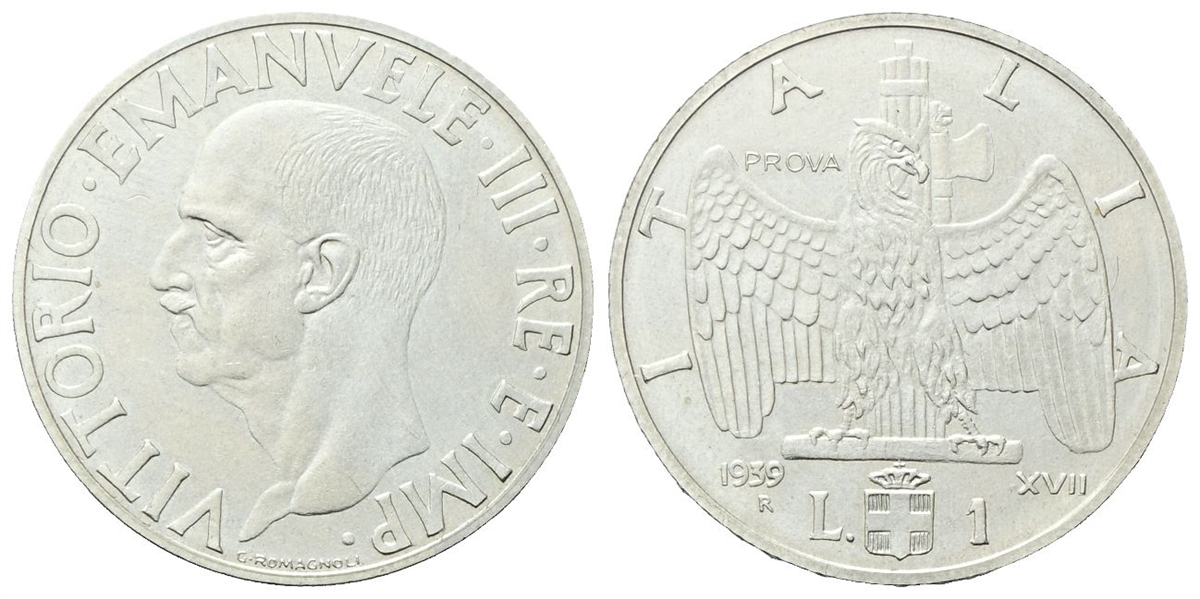 Dr. VITTORIO EMANUELE III RE E IMP. Testa scoperta del sovrano, rivolta a d.; sotto, G Romagnoli. Rv. ITALIA. Fascio littorio sormontato da aquila rivolta a s. ad ali spiegate in posizione frontale; nell’esergo, stemma sabaudo tra valore e data; in alto, a s., PROVA.