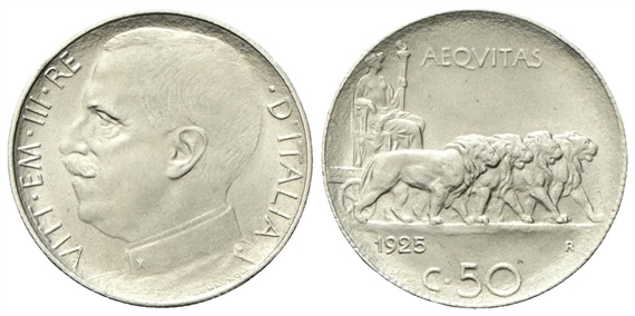 Vittorio Emanuele III, 1900-1943. 50 Centesimi 1925 Roma, Leoni, bordo rigato.