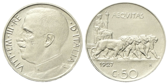 Vittorio Emanuele III, 1900-1943. 50 Centesimi 1927 Roma, Leoni, bordo liscio (senza il nome del modellista).