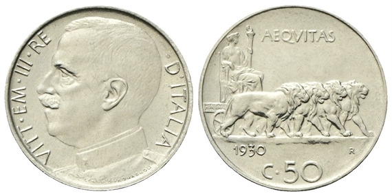 Vittorio Emanuele III, 1900-1943. 50 Centesimi 1930 Roma, Leoni, bordo Rigato.