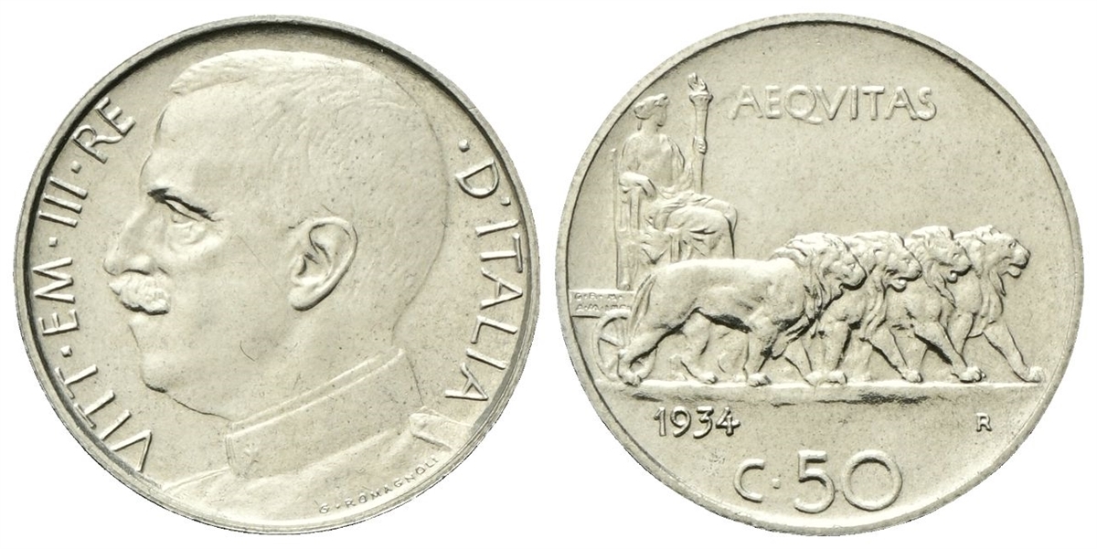 Vittorio Emanuele III, 1900-1943. 50 Centesimi 1934 Roma, Leoni, bordo Rigato.