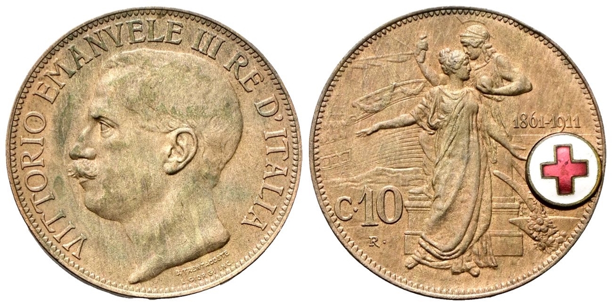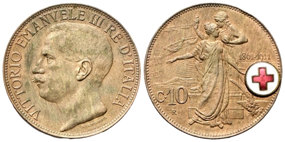 Vittorio Emanuele III, 1900-1943. Medaglia / moneta 10 Centesimi 1911 Roma, Cinquantenario (Croce Rossa Italiana).